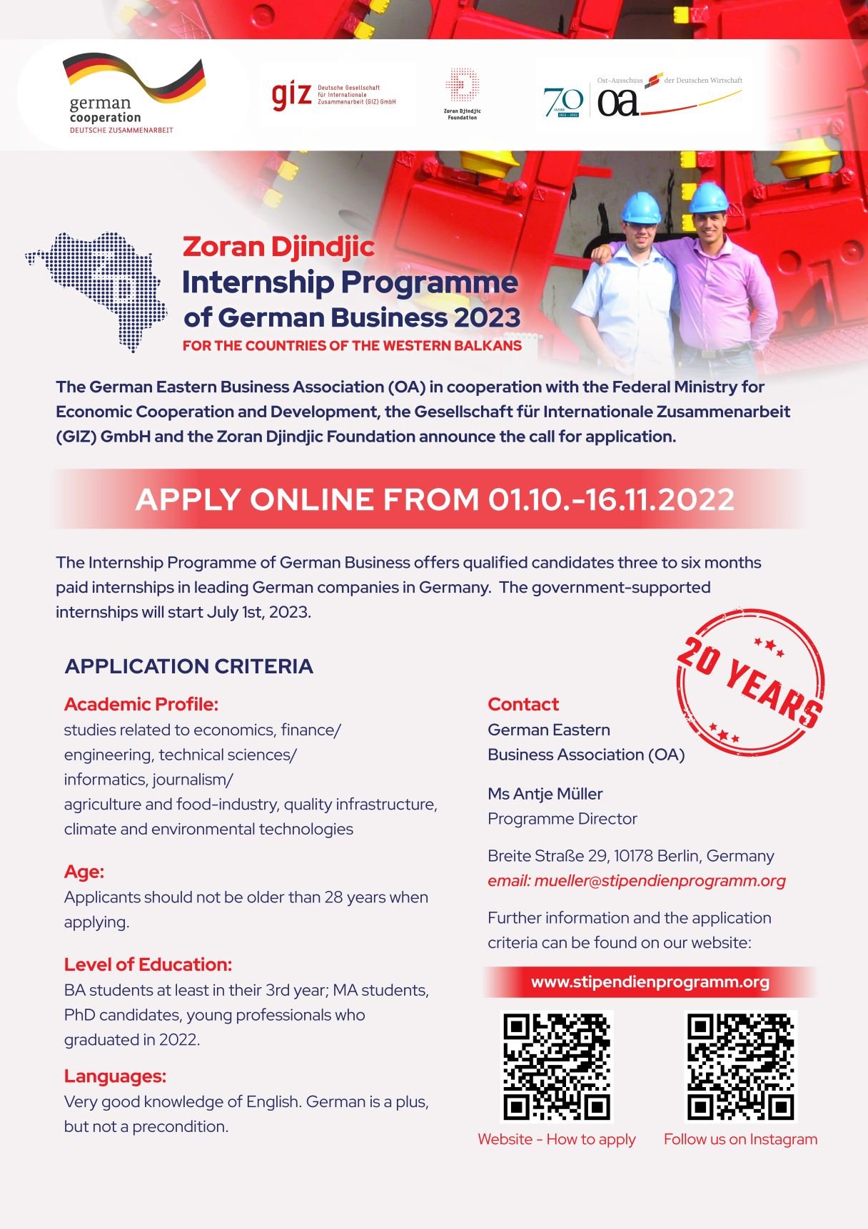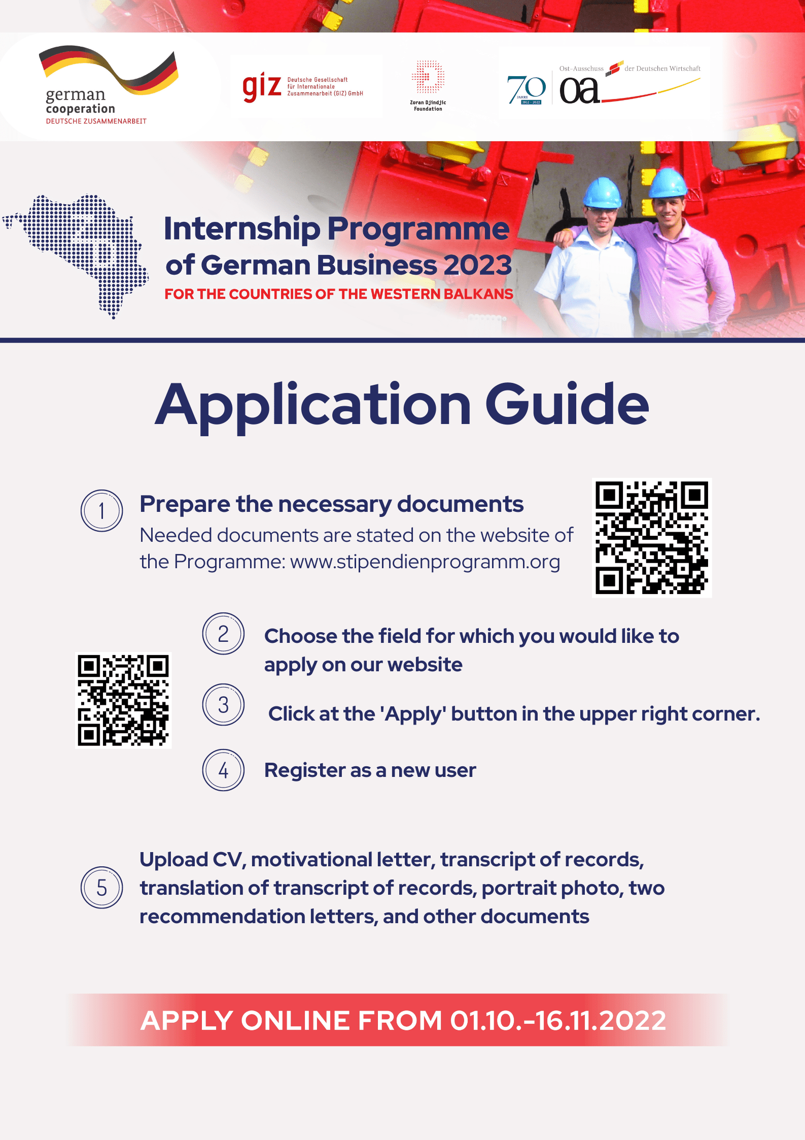 Na ispod navedenoj veb stranici kao i u prilozima možete videti sve potrebne informacije vezane za Program stipendija nemačke privrede Zoran Đinđić.