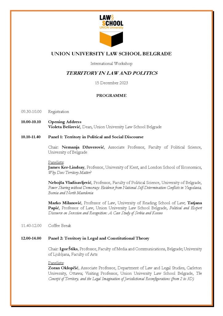 On 15 December 2023, the Union University Belgrade Law School (Union Law Belgrade) will hold a workshop entitled Territory in Law and Politics. The workshop revisits the topic of territory from different perspectives of political and social discourse, legal and constitutional theory, international and transnational law and national law and policy.